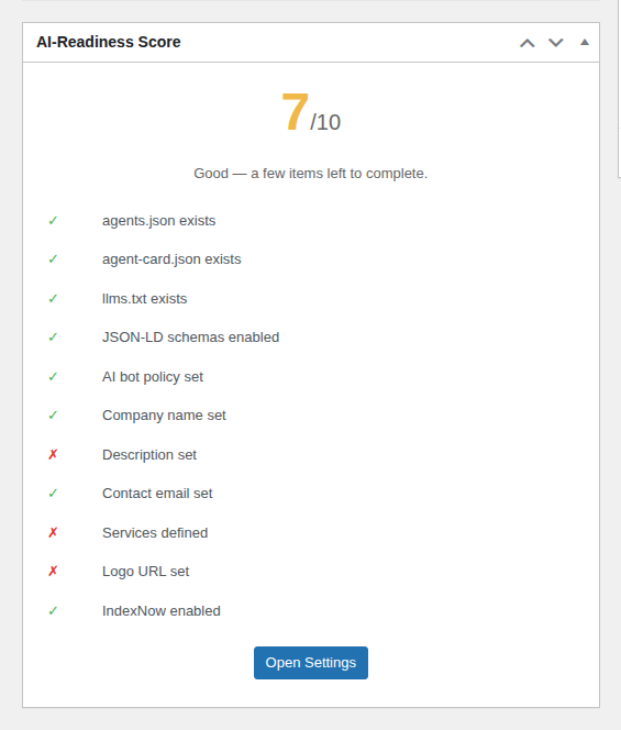 - Full AI Discovery: agents.json, agent-card.json, llms.txt, JSON-LD, REST API, AI Bot Management, Crawler Analytics, IndexNow, WP Abilities.